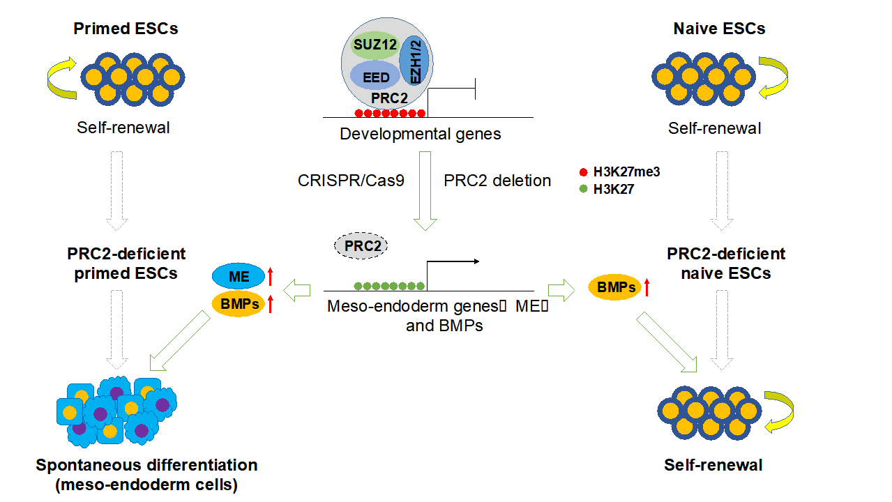 系統(tǒng)闡釋了PRC2復(fù)合物及其介導(dǎo)的組蛋白修飾在人多能干細(xì)胞干性退出及早期三譜系細(xì)胞命運(yùn)決定的作用機(jī)制。