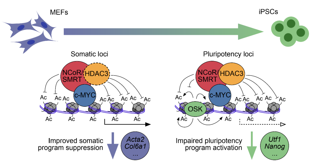 轉(zhuǎn)錄輔助抑制因子NCoR/SMRT復(fù)合物通過(guò)介導(dǎo)組蛋白去乙?;纬审w細(xì)胞重編程的關(guān)鍵障礙(2018,Nature Cell Biology)。