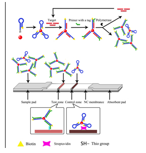 廣州生物院曾令文研究組成功開發(fā)出一種基于核酸等溫鏈置換反應(yīng)技術(shù)與膠體金技術(shù)的核酸檢測生物傳感器,該生物傳感具有以下三個(gè)特點(diǎn):1.簡單快速,從核酸到檢測結(jié)果30分鐘完成,無需復(fù)雜的檢測儀器,僅需恒溫42度;2.高靈敏度,檢測最低限可達(dá)0.01fM;3.高特異性,可區(qū)分單堿基突變。該生物傳感器克服了傳統(tǒng)檢測方法的操作技術(shù)復(fù)雜、耗時(shí)長、需要特殊儀器等缺陷。