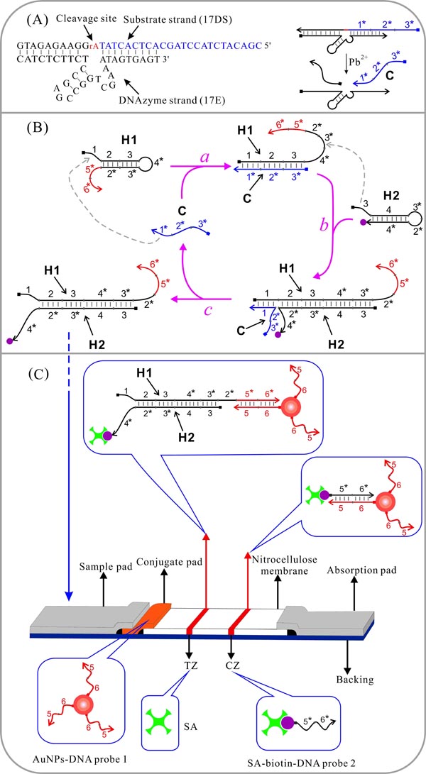 鉛離子是一類主要的環(huán)境污染源,對(duì)人體健康以及生態(tài)環(huán)境具有極大的危害和致癌性。傳統(tǒng)的檢測(cè)方法主要是一些色譜、質(zhì)譜技術(shù),但操作麻煩,需要昂貴的儀器,因而限制了它們的廣泛應(yīng)用。中科院廣州生物醫(yī)藥與健康研究院曾令文研究組以鉛離子特異性的DNAzyme為分子識(shí)別元件,構(gòu)建了一種非酶信號(hào)擴(kuò)增試紙條用于鉛離子的超靈敏檢測(cè)。當(dāng)有鉛離子存在時(shí),切割的DNAzyme的底物鏈會(huì)啟動(dòng)一系列的DNA自組裝過程,從而達(dá)到信號(hào)放大的目的。
