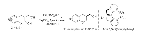 中科院廣州生物醫(yī)藥與健康研究院蔡倩研究組采用不對稱去對稱化的方法,首次高光學(xué)選擇性的實現(xiàn)了鈀催化的分子內(nèi)芳基C-O偶聯(lián)反應(yīng)。在Pd(OAc)2及螺環(huán)雙膦配體的作用下,(2-碘芐基)1,3-丙二醇類化合物通過分子內(nèi)的去對稱化C-O偶聯(lián)反應(yīng),可以較好收率及高光學(xué)選擇性得到偶聯(lián)產(chǎn)物。這也是首次通過去對稱化C-O偶聯(lián)的方法,實現(xiàn)碳手性中心的構(gòu)建。相關(guān)成果已經(jīng)發(fā)表在《有機快報》(Org.Lett. 2013, 15, 6022-6025)。
