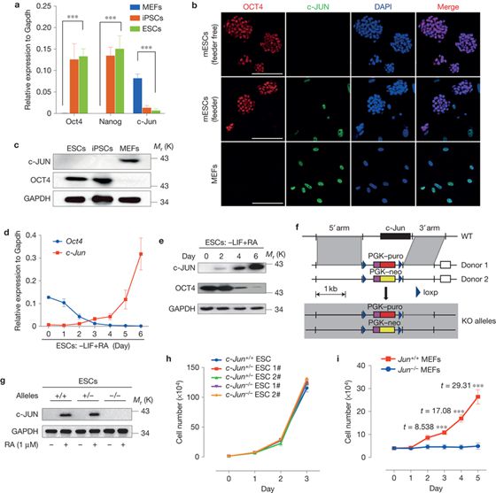 通過這個思路,實驗組發(fā)現(xiàn)一個非常著名的癌基因——c-Jun在表達上非常吻合:它僅在體細胞中表達,在胚胎干細胞或iPS細胞中完全不表達,而在重編程過程中觀察不到明顯的下降。進一步的實驗發(fā)現(xiàn),在胚胎干細胞中敲除c-Jun對多能性毫無影響,但成纖維細胞中敲除c-Jun會造成細胞完全無法增殖,而在胚胎干細胞強制表達c-Jun,胚胎干細胞會迅速分化并失去多能性,這些結(jié)果都提示c-Jun與多能性是完全不相容的。在體細胞重編程中的結(jié)果也完全支持這一結(jié)論,強制表達c-Jun后,Yamanaka因子介導(dǎo)的體細胞重編程完全被抑制,而通過多種途徑抑制c-Jun,則能有效地提升iPS細胞獲得的效率。