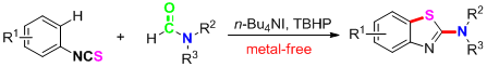 朱強課題組在高價碘參與或者催化的脫氫偶聯(lián)反應用于合成含氮雜環(huán)這一研究方向,已經(jīng)取得了一些成果 (Chem. Eur. J., 2012, 18, 13964; Org. Lett., 2013, 15, 3476; Chem. Commun., 2013, 49, 7352.)。在此基礎上,課題組最近發(fā)展了 “一鍋法”合成2-胺基苯并噻唑類衍生物的新方法。2-胺基苯并噻唑這一核心骨架廣泛存在于天然產(chǎn)物和藥物分子中,具有廣譜的生物活性。該方法以各種一級、二級脂肪胺、芳胺甚至氨基酸酯衍生的甲酰胺為胺源,通過碘化物和過氧化物促進的脫羰基形成相應的胺基自由基中間體,然后對芳基異硫氰酸酯的加成以及相應的硫自由基的環(huán)合,得到各種2-位胺基取代的苯并噻唑。該方法與傳統(tǒng)的合成這類化合物的方法相比,具有胺基類型廣泛、無過渡金屬參與等優(yōu)點。