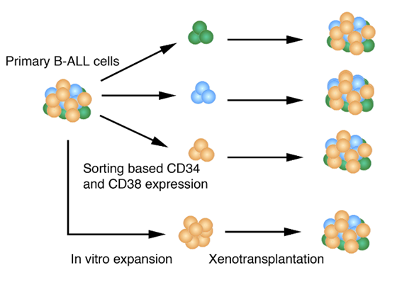 CD34和CD38表達(dá)不同的原代成人B-ALL細(xì)胞群均可重建白血病