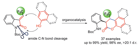 胡文輝組趙軍嶺副研究員帶領(lǐng)的研究小組,使用奎寧衍生的方酰胺為催化劑,以2-吲哚酮衍生的不飽和酰胺和萘酚為反應(yīng)原料,在僅用2.5mol%的催化劑用量下就可高效的合成光活性的α-芳香基-β-三氟甲基二氫豆香素衍生物。在這個(gè)反應(yīng)過程中2-吲哚酮中的酰胺砌塊作為親電試劑與酚羥基發(fā)生C-N鍵切斷與分子內(nèi)酯化反應(yīng),這個(gè)過程一般需要在強(qiáng)酸、強(qiáng)堿或者過渡金屬催化下發(fā)生,本研究代表了一種溫和、高效的酰胺C-N鍵切斷新方法,為以后酰胺砌塊的活化和轉(zhuǎn)化提供了新思路。