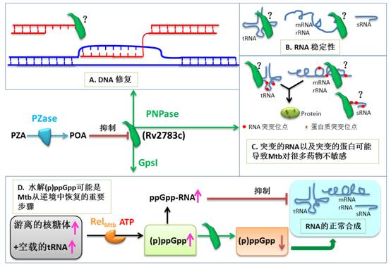 研究團(tuán)隊(duì)發(fā)現(xiàn),過(guò)表達(dá)突變的Rv2783c基因可以導(dǎo)致Mtb對(duì)PZA耐藥;POA可以與Rv2783蛋白結(jié)合,但是PZA不與之結(jié)合,同時(shí)POA也不與Rv2783蛋白結(jié)合;首次證實(shí)了基因Rv2783c編碼的Rv2783蛋白具有聚核苷酸磷酸化酶(PNPase)功能和鳥(niǎo)苷五磷酸合成酶(GPS I) 活性(如圖所示)。在研究PNPase功能時(shí),研究組開(kāi)創(chuàng)性地探索新的分析方法并取得成功。其結(jié)果顯示,Rv2783蛋白具有不依賴模板而合成ssDNA和RNA的功能,同時(shí)具有降解ssDNA和RNA的功能。GPS I功能主要負(fù)責(zé)水解而非合成(p)ppGpp。POA可以干擾這些功能而PZA本身并不干擾這些功能。這些功能是Mtb存活,特別是在逆境存活的重要生理保障。POA干擾DNA修復(fù),或者干擾各種RNA的穩(wěn)定性,甚至是合成錯(cuò)誤的RNA進(jìn)而合成突變的蛋白可能很好解釋“持留(persistence)”現(xiàn)象,即群體中只有小部細(xì)菌因?yàn)楫a(chǎn)生了突變的蛋白從而表型耐藥(對(duì)藥物耐受),但是它們的基因組并未發(fā)生改變。另外,Rv2783也可能是通過(guò)抑制結(jié)核菌水解(p)ppGpp從而阻止結(jié)核菌從逆境中恢復(fù)過(guò)來(lái)而殺死處于持留狀態(tài)的結(jié)核菌。也我們的研究結(jié)果顯示該蛋白很可能是PZA的新靶標(biāo)。