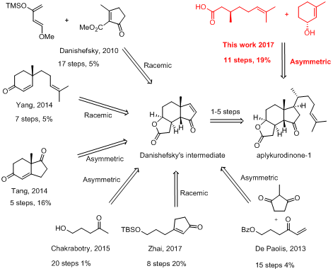 Aplykurodinone-1源于降解的海洋甾體,于2005年在Syphonota geographica海洋軟體動物中分離得到。由于潛在的生物活性及其復雜的結(jié)構(gòu)特征,它引起了大量合成研究人員的研究興趣。截止目前,共有六個課題組報道了相關(guān)的研究工作。他們的策略各有特色,但都包含了Danishefsky路線中的關(guān)鍵中間體,導致手性控制不好,總產(chǎn)率偏低,合成效率不太理想。