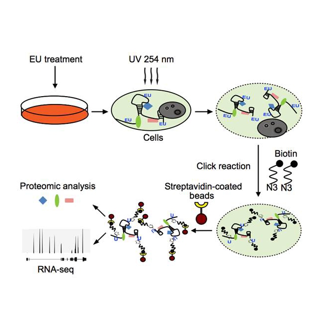 廣州生物院研究員Miguel A. Esteban(米格爾·埃斯特班)、張必良和副研究員鮑習(xí)琛領(lǐng)銜的科研團(tuán)隊(duì)設(shè)計(jì)了RICK(Newly Transcribed RNA interactome using click chemistry)技術(shù),利用核酸標(biāo)記技術(shù),巧妙地將新合成的RNA標(biāo)記上生物素,通過(guò)鏈霉親和素偶聯(lián)的磁珠,分離得到相應(yīng)被標(biāo)記RNA分子和與其相結(jié)合的蛋白分子。