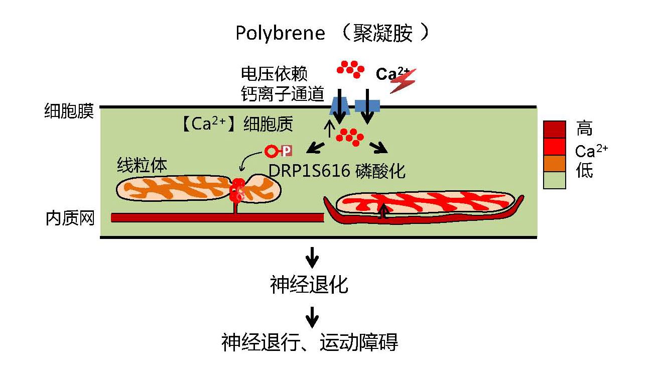 劉興國(guó)課題組通過體內(nèi)外模型研究了低劑量polybrene對(duì)神經(jīng)系統(tǒng)的毒性。在體內(nèi)方面,側(cè)腦室注射polybrene造成小鼠行為學(xué)(運(yùn)動(dòng)障礙)和病理學(xué)(神經(jīng)死亡和膠質(zhì)增生)上的神經(jīng)退行表型。在體外方面,polybrene會(huì)導(dǎo)致人誘導(dǎo)多能干細(xì)胞(iPSCs)分化來源的神經(jīng)元出現(xiàn)退化。進(jìn)一步發(fā)現(xiàn)polybrene激活VDCC門控的胞外鈣內(nèi)流,導(dǎo)致了神經(jīng)元胞內(nèi)鈣濃度的異常升高;升高的胞內(nèi)鈣雙向調(diào)控兩種細(xì)胞器異常重塑:DRP1S616位磷酸化介導(dǎo)的線粒體斷裂和代謝異常,內(nèi)質(zhì)網(wǎng)片段化并和線粒體耦合介導(dǎo)線粒體鈣超載,從而啟動(dòng)神經(jīng)退化。