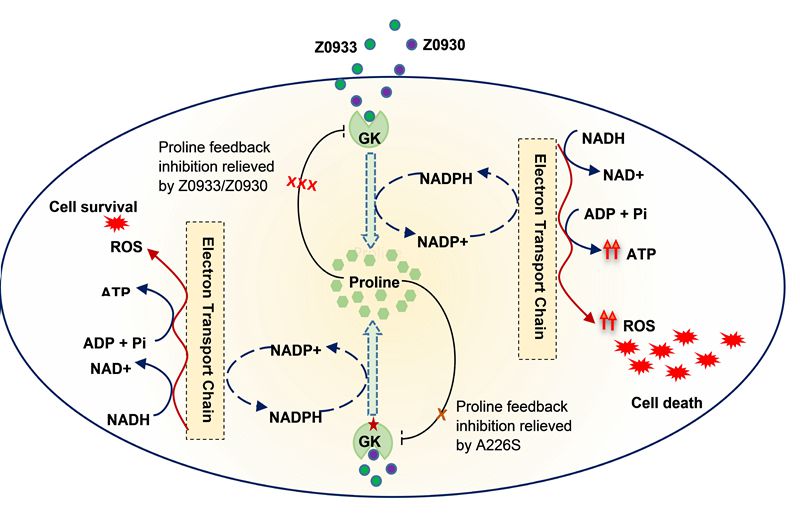 目前靶向篩選抗TB藥物研發(fā)的策略幾乎都是尋找Mtb關鍵代謝酶的抑制劑。近日,中國科學院廣州生物醫(yī)藥與健康研究院團隊聯(lián)合廣州市胸科醫(yī)院(劉健雄等)、深圳市第三人民醫(yī)院(黃乃淇)及奧爾巴諾瓦大學中心KTH皇家理工學院(周洋)等單位合作發(fā)現(xiàn)谷氨酸激酶(glutamate kinase, GK)可能成為抗TB藥物的新靶標。新的喹啉類化合物Z0930/Z0933(專利已授權(quán)ZL 201310385431.X)以前藥的形式起作用。其活性形式通過與脯氨酸競爭結(jié)合GK增強而非抑制GK的活性,可以破壞脯氨酸合成通路的反饋抑制,進而影響電子傳遞鏈,導致產(chǎn)生過多的活性氧(reactive oxygen species , ROS),從而殺死Mtb。突變的GK活性不受化合物Z0930/Z0933的影響,從而導致Mtb可以忍受較高濃度這類化合物。GK的突變點A226S可能位于Z0930/Z0933結(jié)合位點(圖1)。本研究首次報道了小分子增強而不是抑制代謝酶的活性可成為潛在抗結(jié)核藥物的新策略。相關研究成果以“Quinoline derivatives kill Mycobacterium tuberculosis by activating glutamate kinase”為題于2019年6月14日在線發(fā)表于Cell系列子刊Cell Chemical Biology。