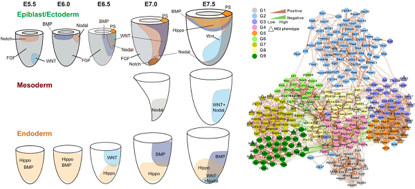 圖3. 胚層關(guān)鍵信號(hào)作用區(qū)域及關(guān)鍵轉(zhuǎn)錄因子調(diào)控網(wǎng)絡(luò)