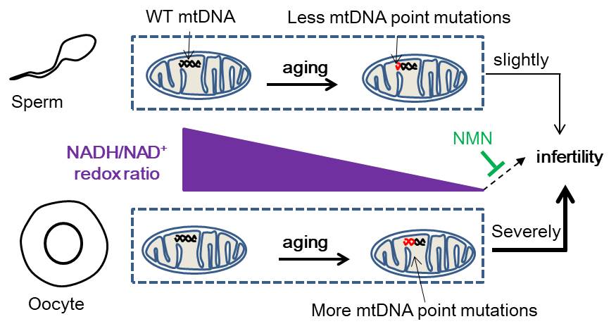 老齡生育不但是生殖與再生醫(yī)學(xué)領(lǐng)域的基本科學(xué)問題,而且是當(dāng)今我國國情的重大國家需求。衰老是影響男性和女性生育能力的關(guān)鍵因素之一,其中女性生育力通常在30歲后下降。另一方面,快速的環(huán)境變化也可能導(dǎo)致近年來不育率急劇上升。線粒體作為細(xì)胞內(nèi)含有DNA的能量工廠,其功能障礙被假設(shè)在年齡和環(huán)境導(dǎo)致的不育中起重要作用。然而,衰老積累的線粒體DNA突變是否以及如何調(diào)節(jié)生育力及其性別依賴性仍然未知。
