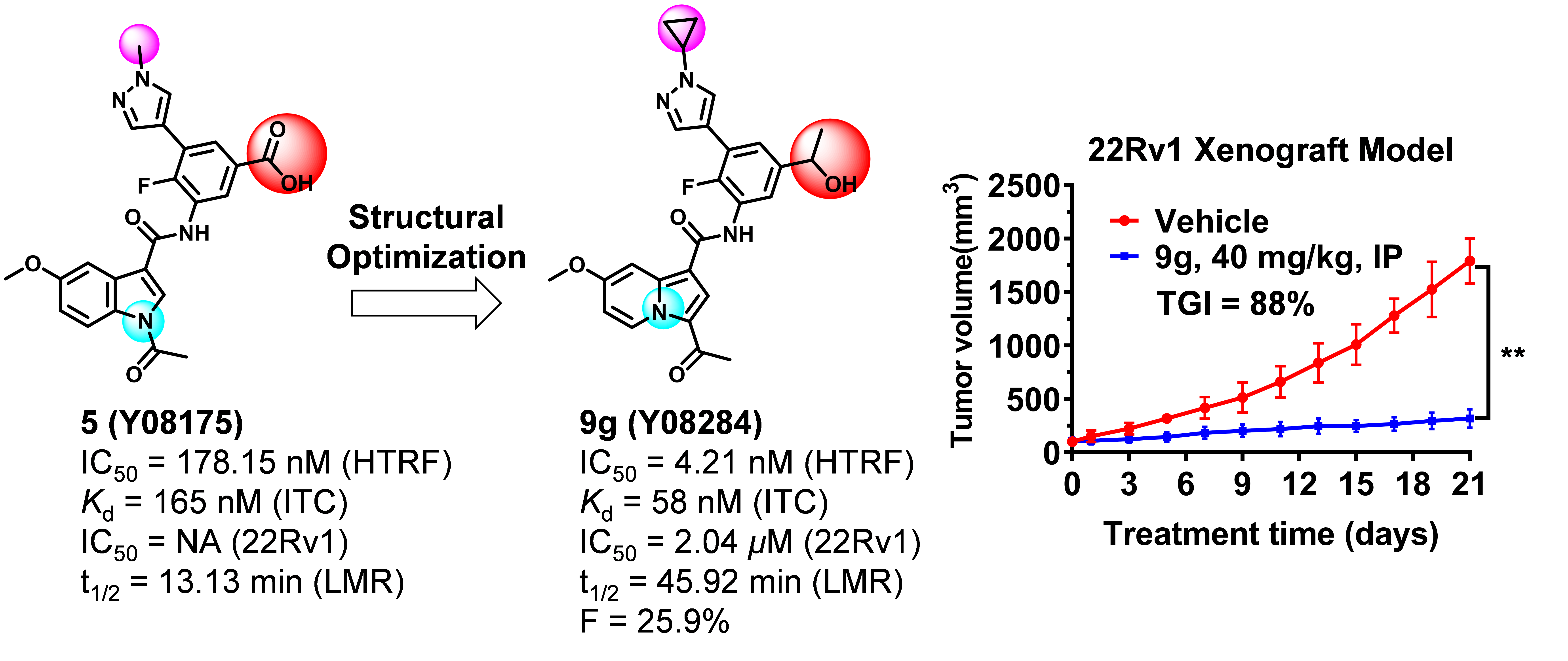 前列腺癌是一種雄激素依賴性的惡性腫瘤,極大地威脅著男性的健康?,F(xiàn)有的治療前列腺癌藥物均很快出現(xiàn)耐藥問題。因此,臨床上急需開展基于新靶點(diǎn)、新機(jī)制的抗前列腺癌藥物研究。為了解決上述問題,中國科學(xué)院廣州生物醫(yī)藥與健康研究院許永課題組針對前列腺癌治療新靶標(biāo)CBP設(shè)計合成了新型小分子抑制劑,代表性分子Y08284經(jīng)過動物實(shí)驗(yàn)證明有望治療耐藥性前列腺癌。該成果于近日以Design, Synthesis, and Biological Evaluation of 1?(Indolizin-3-yl)ethan-1-ones as CBP Bromodomain Inhibitors for the Treatment of Prostate Cancer為題發(fā)表在Journal of Medicinal Chemistry的Epigenetics專刊上。