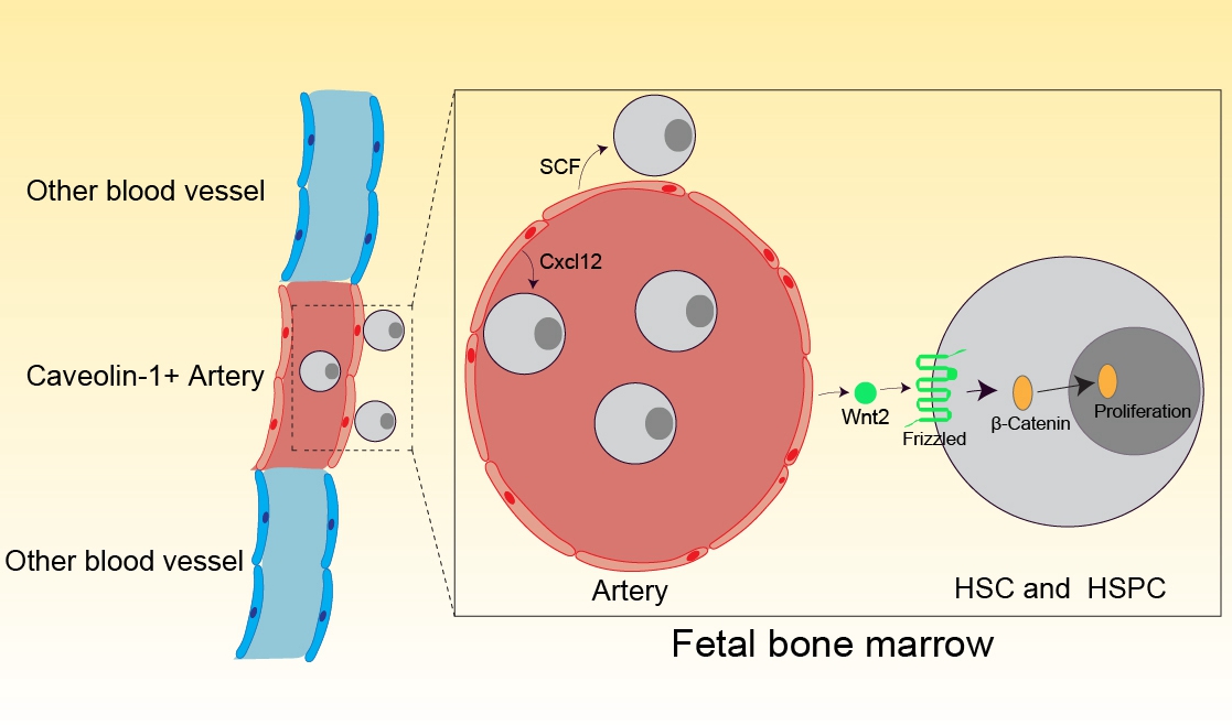 這項(xiàng)研究利用遺傳操作小鼠通過單細(xì)胞測序?qū)Ρ确治霭l(fā)現(xiàn),造血干細(xì)胞和骨髓微環(huán)境在胚胎期與成年期差異巨大,動(dòng)脈血管在胚胎骨髓中非常重要。在小鼠胚胎發(fā)育第16.5天,絕大多數(shù)造血干/祖細(xì)胞都位于動(dòng)脈血管旁。研究者發(fā)現(xiàn)此時(shí)的骨髓動(dòng)脈可以釋放Wnt2,動(dòng)脈來源的Wnt信號(hào)影響造血干/祖細(xì)胞的擴(kuò)增。而利用重組蛋白Wnt2在體外處理造血干/祖細(xì)胞,可以促進(jìn)造血干/祖細(xì)胞的增殖、增強(qiáng)造血干/祖細(xì)胞形成體外克隆的能力。