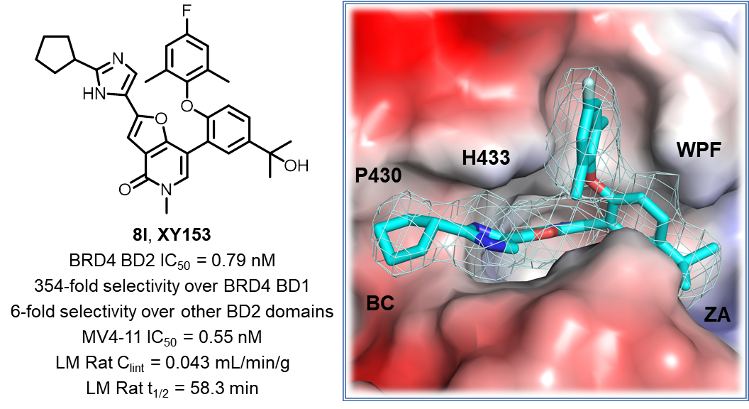 近日,中國科學(xué)院廣州生物醫(yī)藥與健康研究院的許永團(tuán)隊(duì)報(bào)道了一系列高結(jié)合活性和高選擇性的BET BD2抑制劑,可作為抗AML的候選藥物,相關(guān)成果近日以“Structure-Based Discovery and Optimization of Furo[3,2-c]pyridin-4(5H)-one Derivatives as Potent and Second Bromodomain (BD2)-Selective Bromo and Extra Terminal Domain (BET) Inhibitors”為題發(fā)表在美國化學(xué)會Journal of Medicinal Chemistry上。