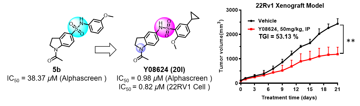 本研究結(jié)合虛擬篩選和基于結(jié)構(gòu)的藥物優(yōu)化策略,合成獲得了結(jié)構(gòu)新穎的先導(dǎo)化合物Y08624(20l)?;衔?/span>Y08624對(duì)TRIM24溴結(jié)構(gòu)域表現(xiàn)出較強(qiáng)的抑制活性(IC50 = 0.98 μM)和良好的選擇性。化合物Y08624可有效抑制多種AR陽(yáng)性前列腺癌細(xì)胞的增殖,并抑制AR和AR調(diào)節(jié)的下游基因的表達(dá)。在22Rv1異種移植前列腺癌小鼠模型中,化合物Y08624可有效抑制腫瘤生長(zhǎng)(TGI = 53%)。該研究為針對(duì)TRIM24溴結(jié)構(gòu)域的功能研究提供了優(yōu)秀的小分子探針,同時(shí)也為治療前列腺癌的藥物開(kāi)發(fā)提供了新的先導(dǎo)化合物。