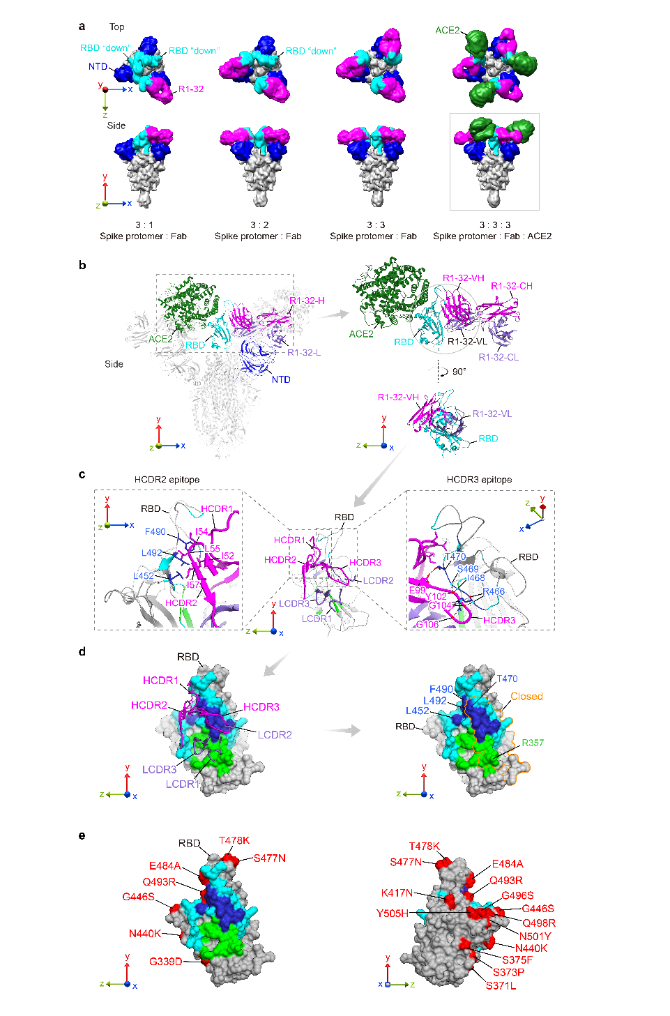 圖1:R1-32與SARS-CoV-2刺突蛋白及R1-32表位結(jié)構(gòu)圖