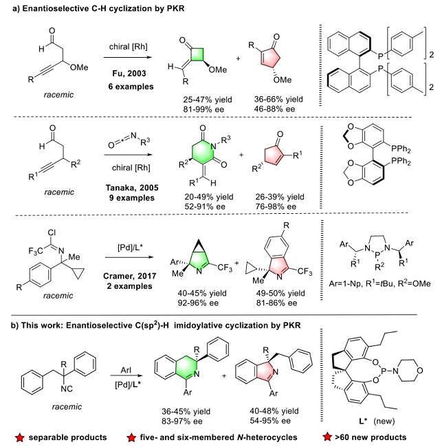 盡管已經(jīng)有一些成功的PKR的例子,但是產(chǎn)物結(jié)構(gòu)不同并可以通過柱層析分離的報(bào)道并不多見。2003年,F(xiàn)u報(bào)道了一種新的銠催化的C-H活化炔鏈上的醛,然后與炔進(jìn)環(huán)化,以良好產(chǎn)率和對映選擇性合成了底物范圍有限的環(huán)丁烷酮和環(huán)戊烯酮。Tanaka等人使用類似的底物和異氰酸酯發(fā)生分子間[4+2]環(huán)加成,得到了庚酰胺和環(huán)戊烯酮的對映選擇性衍生物。2017年,Cramer通過PKR反應(yīng)合成兩種獨(dú)特的氮雜環(huán)骨架,3-氮雜雙環(huán)[3.1.0]己烷和含季立體生成中心的1H-異吲哚。但是,在這些反應(yīng)中,底物的適用范圍比較窄。此外,含有季碳立體中心的雜環(huán)廣泛存在于天然產(chǎn)物、藥物和農(nóng)藥中,然而,對它們的對映選擇性合成是一項(xiàng)具有挑戰(zhàn)性的任務(wù)(圖2)。