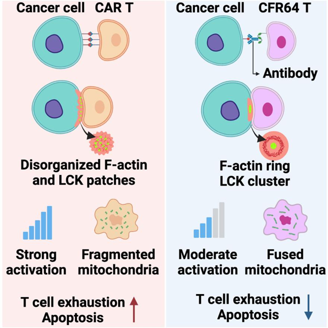 近日,中國(guó)科學(xué)院廣州生物醫(yī)藥與健康研究院李鵬團(tuán)隊(duì)、徐州醫(yī)科大學(xué)徐開林團(tuán)隊(duì)以及廣州實(shí)驗(yàn)室Jean Paul Thiery團(tuán)隊(duì)在Cell Reports在線發(fā)表題為“T lymphocytes expressing the switchable chimeric Fc receptor CD64 exhibit augmented persistence and antitumor activity”的研究論文。該研究基于CD64可結(jié)合抗體Fc片段的特性設(shè)計(jì)出了一種可以利用抗體進(jìn)行腫瘤相關(guān)抗原重定向的開關(guān)型CAR-T細(xì)胞(CFR64 T)。在體內(nèi)外實(shí)驗(yàn)中,CFR64 T細(xì)胞展現(xiàn)出優(yōu)于傳統(tǒng)CAR-T細(xì)胞的抗耗竭能力以及抗腫瘤持續(xù)性。在小鼠模型中,CFR64 T細(xì)胞的記憶樣T細(xì)胞比例顯著提高。進(jìn)一步研究揭示,CFR64 T細(xì)胞所形成的免疫突觸較傳統(tǒng)CAR-T細(xì)胞更小,能更溫和地激活T細(xì)胞,同時(shí)CFR64 T細(xì)胞對(duì)抗原刺激表現(xiàn)出更為健康的線粒體狀態(tài)。
