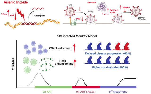 激活殺傷(shock and kill)策略被認為最有希望治愈艾滋病的策略,即通過使用儲存庫激活藥物激活潛伏的HIV儲存庫,促進HIV原病毒轉錄和復制,以便更容易被免疫系統(tǒng)或抗病毒藥物識別而清除。三氧化二砷(As2O3,砒霜的主要成分)作為一種有效治療急性早幼粒細胞白血?。ˋPL)的臨床藥物。研究團隊使用三氧化二砷聯(lián)合ART治療猴艾滋病毒(SIV)急性感染獼猴,發(fā)現(xiàn)該療法能夠顯著延緩艾滋病的疾病進展,甚至部分獼猴停藥后長期未出現(xiàn)病毒反彈。同時,對三氧化二砷影響HIV儲存庫的機制進行探討,發(fā)現(xiàn)三氧化二砷能夠影響HIV生命周期的多個過程的基因表達,包括HIV進入細胞、轉錄起始、感染相關、宿主限制因子。重要的是,發(fā)現(xiàn)三氧化二砷具有特異性誘導儲存庫細胞凋亡的潛能。