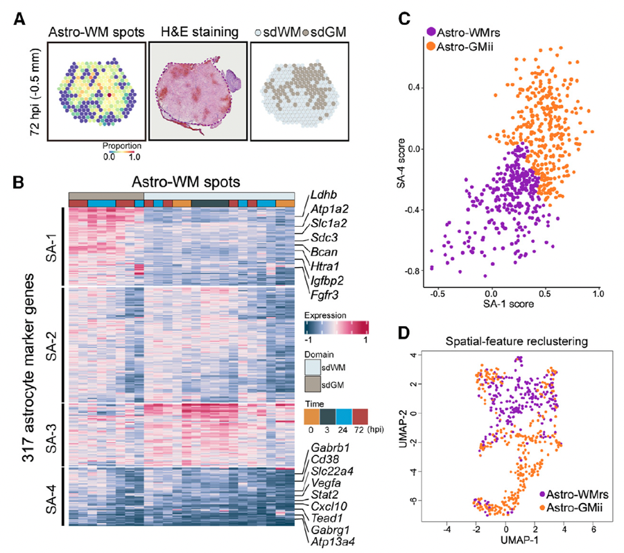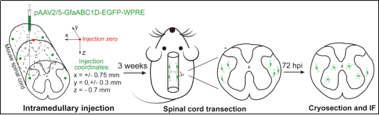 通過 SA-CCC細(xì)胞互作網(wǎng)絡(luò)分析,研究人員發(fā)現(xiàn)了一類在SCI后從脊髓白質(zhì)遷移到脊髓灰質(zhì)的星型膠質(zhì)細(xì)胞亞群(圖1C)。接著通過脊髓實質(zhì)注射和lineage tracing實驗,證實了SCI后這類由白質(zhì)向灰質(zhì)定向遷移的星型膠質(zhì)細(xì)胞亞群的存在及其細(xì)胞來源(圖3),該團(tuán)隊將其命名為“injury-induced, gray matter-relocated astrocytes (Astro-GMii)”。