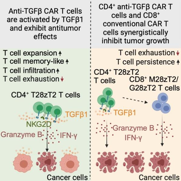 研究團(tuán)隊(duì)研發(fā)了一款新型靶向TGFβ的CAR-T細(xì)胞(T28zT2 T細(xì)胞),通過中和TGFβ信號(hào)逆轉(zhuǎn)腫瘤微環(huán)境中的免疫抑制,并展現(xiàn)出顯著的抗腫瘤潛力。研究發(fā)現(xiàn),CD4+?T28zT2細(xì)胞在TGFβ1刺激下可在血液和腫瘤中長(zhǎng)期存活,并分泌Granzyme B和IFN-γ直接殺傷腫瘤;而CD8+?T28zT2 T細(xì)胞則未顯示同等抗腫瘤效應(yīng)。進(jìn)一步分析表明,腫瘤浸潤(rùn)的CD4+?T28zT2細(xì)胞高表達(dá)TCF-1、IL7R和CXCR3,呈現(xiàn)記憶樣T細(xì)胞特征,同時(shí)上調(diào)NKG2D并降低PD-1/LAG3等耗竭標(biāo)志物,顯著增強(qiáng)其抗腫瘤活性。此外,CD4+?T28zT2細(xì)胞能夠重塑腫瘤微環(huán)境,協(xié)同增強(qiáng)靶向GPC3或MSLN的CD8+?CAR-T細(xì)胞的抗腫瘤能力,呈現(xiàn)倍增效應(yīng)。