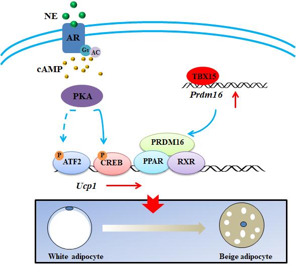 肥胖及其相關(guān)代謝疾病包括Ⅱ型糖尿病、心血管疾病和癌癥等嚴重威脅人類健康。肥胖的發(fā)生主要由能量失衡導致,因此提高機體能量消耗能夠有效抑制肥胖發(fā)生。哺乳動物體內(nèi)的褐色脂肪細胞和米色脂肪細胞中特異性高表達解偶聯(lián)蛋白1(UCP1),可以將能量轉(zhuǎn)化為熱量,從而促進能耗。通過激活褐色脂肪細胞產(chǎn)熱及促進米色脂肪細胞生成,進而提高機體能耗,已成為治療肥胖及代謝相關(guān)疾病的研究熱點。