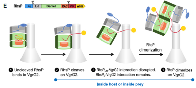 本研究通過生化實驗和冷凍電鏡等手段,捕捉了效應(yīng)蛋白自水解前后瞬間的構(gòu)象變化,發(fā)現(xiàn)RhsP的自水解過程引發(fā)了Rhs桶狀結(jié)構(gòu)的構(gòu)象變化,揭示了釋放核酸酶毒素的分子機(jī)制,同時也發(fā)現(xiàn)了VIR區(qū)域構(gòu)象變化促進(jìn)的RhsP二聚體形成,是其靶向獵物細(xì)胞的關(guān)鍵步驟(圖3)。