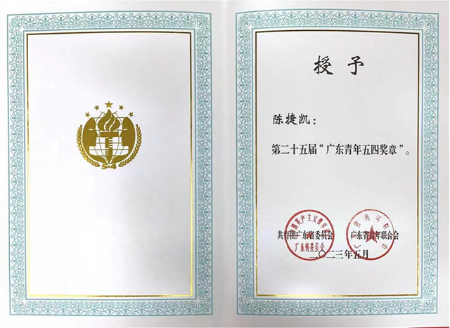 這枚廣東省五四青年獎章充分展示了陳捷凱胸懷“國之大者”,帶領(lǐng)團隊在科技創(chuàng)新實踐中施展才干、艱苦奮斗、建功立業(yè)的擔當,忠誠踐行了“請黨放心、強國有我”的青春誓言。