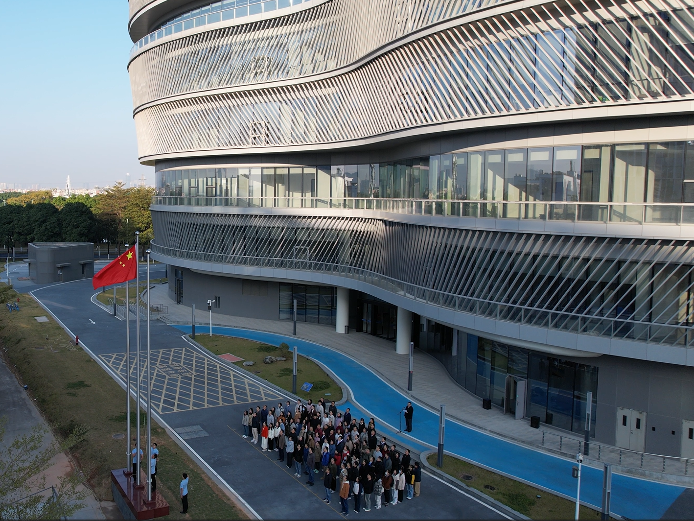 2025年1月3日上午,廣州健康院在生物島園區(qū)舉行新年升國旗儀式。研究院領(lǐng)導(dǎo)班子、細(xì)胞譜系設(shè)施建設(shè)指揮部成員、已進(jìn)駐譜系設(shè)施研發(fā)樓的研究團(tuán)隊(duì)、譜系設(shè)施建設(shè)工程辦公室、工程技術(shù)中心等110多名師生員工參加了升國旗儀式。本次升旗儀式同時(shí)也是譜系設(shè)施建設(shè)支部、譜系中心支部、裝備中心支部、數(shù)字中心支部和管理支部五個(gè)支部的聯(lián)合主題黨日。