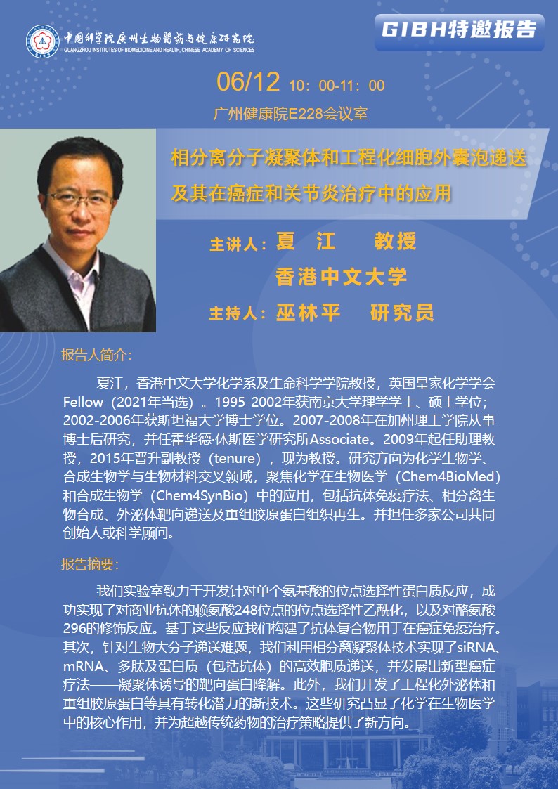 2025年6月12日特邀報(bào)告:相分離分子凝聚體和工程化細(xì)胞外囊泡遞送及其在癌癥和關(guān)節(jié)炎治療中的應(yīng)用