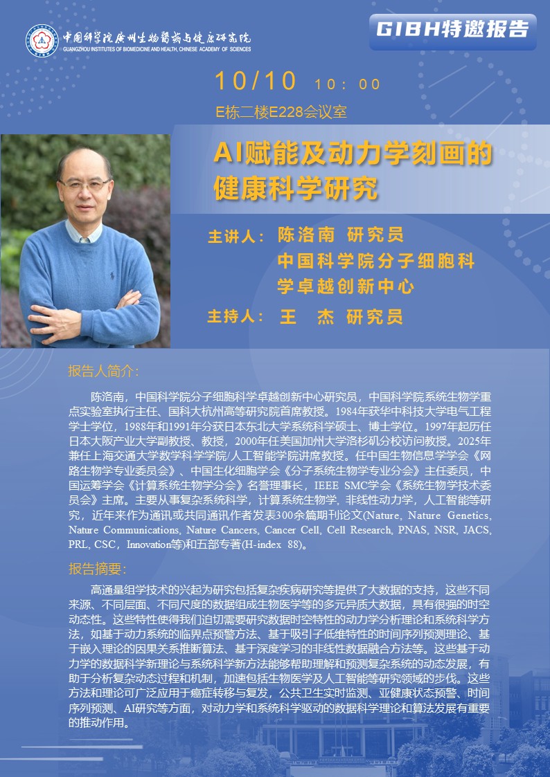 2025年10月10日特邀報告:AI賦能及動力學(xué)刻畫的健康科學(xué)研究