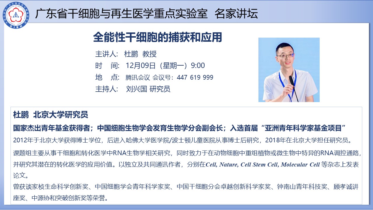 2024年12月9日廣東省干細(xì)胞與再生醫(yī)學(xué)重點實驗室名家講壇:全能性干細(xì)胞的捕獲和應(yīng)用
