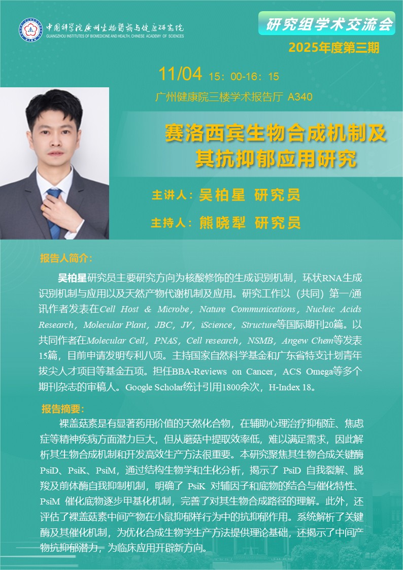 2025年4月11日研究組學術交流會(2025年度第三期):賽洛西賓生物合成機制及其抗抑郁應用研究