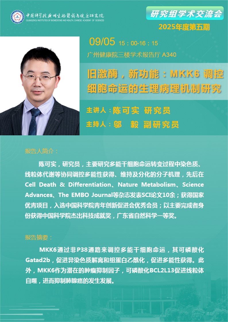 2025年5月9日研究組學(xué)術(shù)交流會(2025年度第五期):舊激酶,新功能:MKK6 調(diào)控細(xì)胞命運的生理病理機制研究